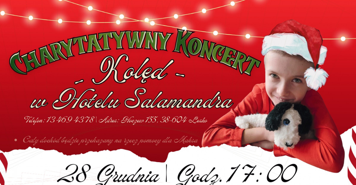 Już 28 grudnia o godz. 17.00 w Hotelu Salamandra w Lesku odbędzie się wyjątkowe wydarzenie łączące świąteczną tradycję z realną pomocą. Zapraszamy wszystkich na Charytatywny Koncert Kolęd, z którego cały dochód trafi na pomoc Maksiowi Tockiemu.